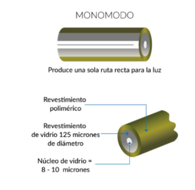 Una fibra monomodo es una fibra óptica en la que solo se propaga un modo de luz. Se logra reduciendo el diámetro del núcleo de la fibra hasta un tamaño (8,3 a 10 micrones) que solo permite un modo de propagación. Su transmisión es paralela al eje de la fibra. A diferencia de las fibras multimodo, las fibras monomodo permiten alcanzar grandes distancias (hasta 400 km máximo, mediante un láser de alta intensidad) y transmitir elevadas tasas de información (10 Gbit/s).