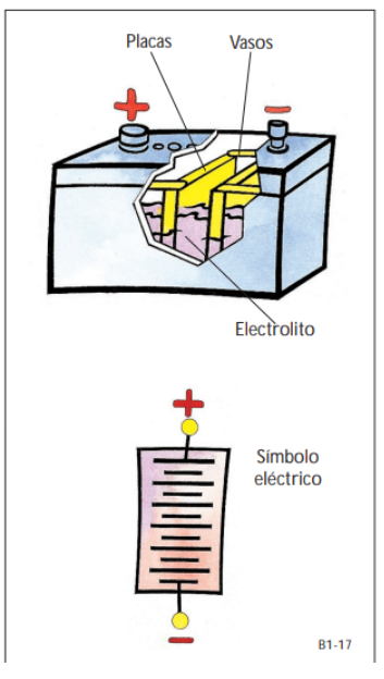La batería está formada por el acoplamiento en serie de varias celdas o vasos. Una batería de 12 voltios posee 6 vasos. El interior de los vasos contiene las placas de plomo, positivas y negativas, que almacenarán los electrones. Cuando la batería se halla completamente cargada cada vaso se encuentra a una tensión de 2,2 voltios, por lo que una batería de 12 voltios de tensión nominal, su tensión real cuando está cargada alcanza los 13,2 voltios.
